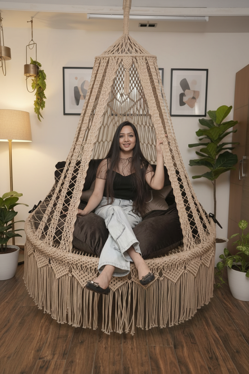 "Transform your space into a cozy haven with our 60-inch Expresso Bed Swing, featuring an intricate design and a soothing color palette that perfectly complements any aesthetic. Complete with a plush mattress, one cylindrical cushion, and two star cushions, it’s the perfect blend of comfort and style.