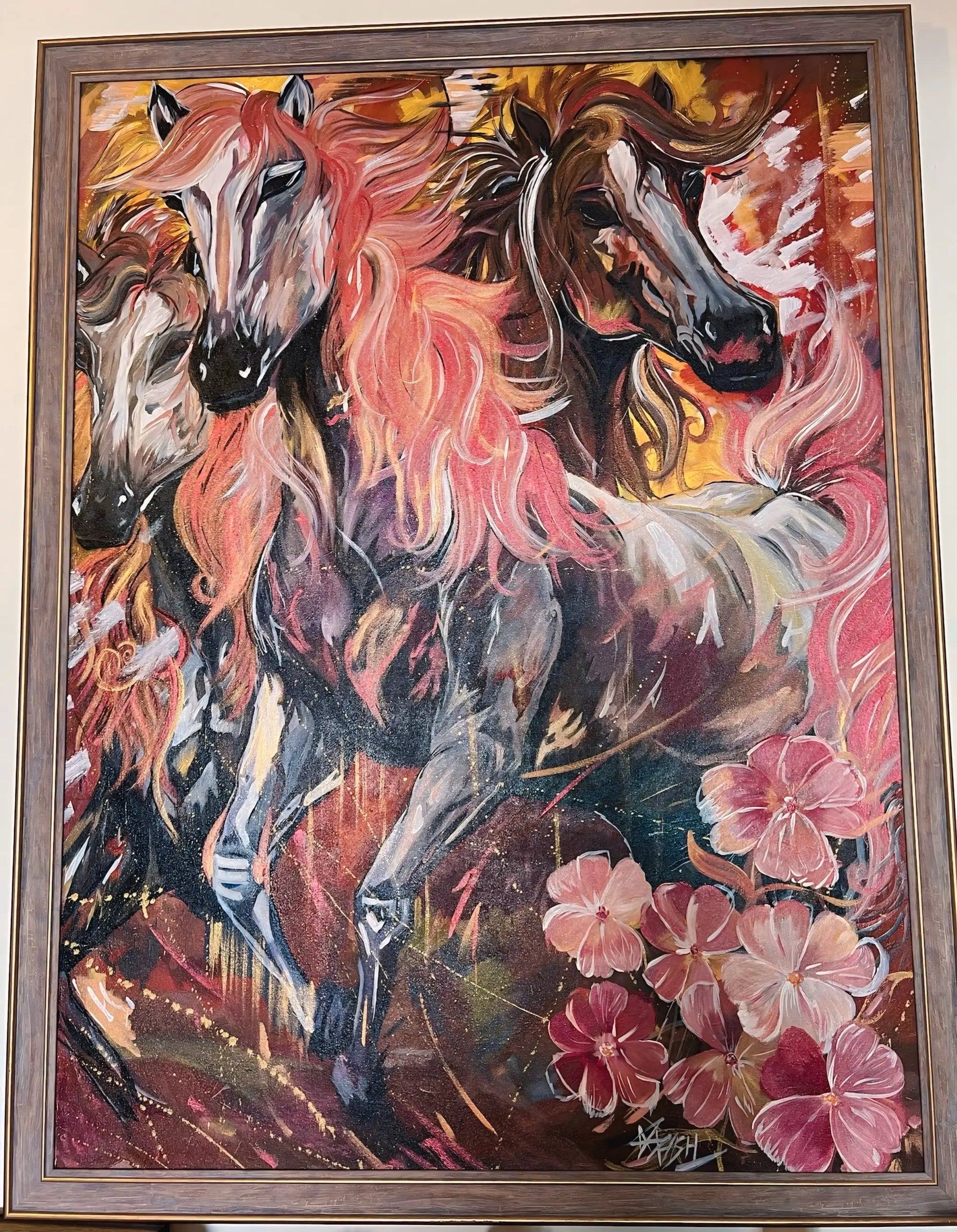 The journey was long… I could never settle on painting them white. I tried countless colours, nothing felt right until I began mixing them all. That’s when my soul finally aligned with what I was seeing… three horses running out of chaos like true warriors.